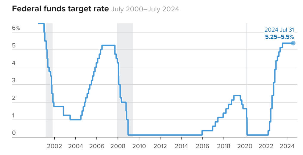聯準會從2022年3月以來,已經升息11次,累計升息21碼,或5.25個百分點。但之後至今,已經8次暫停升息(2023年的9月、11月、12月,以及2024年1月、3月、5月、6月、7月),如下圖,翻攝CNBC官網。