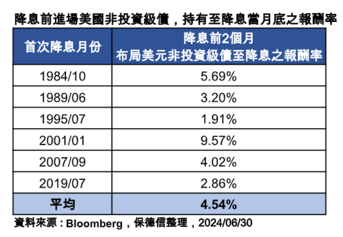 PGIM保德信美元非投資等級債券基金經理人張世民表示,自1984年以來,市場共經歷過6次聯準會宣布降息,資料顯示,在降息前2個月布局投資美元非投資級債至降息該月底,正報酬機率百分百,表現最佳的為2001年時的近一成報酬率,總計6次的平均報酬率達4.54%,加上本次美國非投資級債受惠於