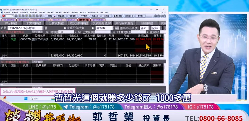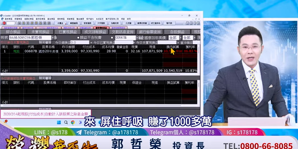 郭哲榮說,上次買0050,從虧500萬變成大賺1151萬,這次買美債也是從虧錢變成大賺1000多萬,也是在創造歷史中。