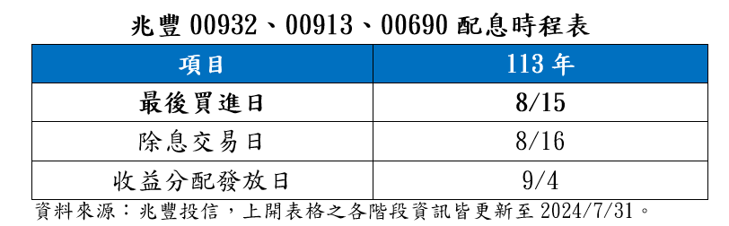 以上三檔ETF除息交易日都是8月16日,想參與領息的最後買進日都是15日,收益分配發放日9月4日。