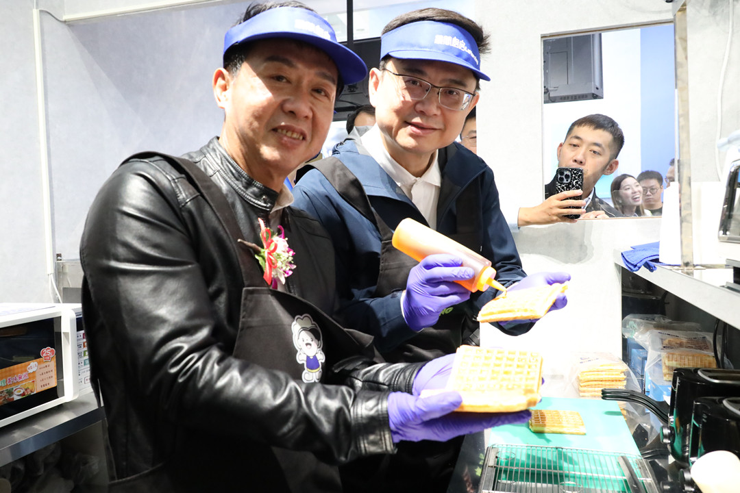 ↑圖說:許智傑(左)與賴瑞隆聯手製作鬆餅。(圖片來源:台灣連鎖加盟促進協會/提供)