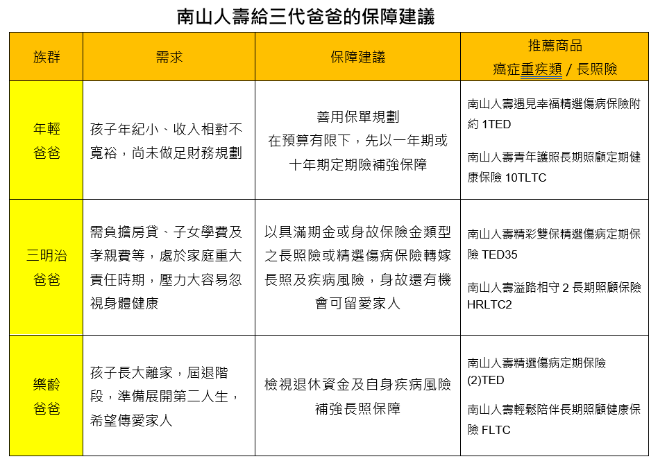 南山人壽說,男人隨著年齡或生涯規劃改變,責任與需要照顧的人多了,漸漸忘了「自己」,可能忽略,一旦需要長照或因疾病導致收入中斷時,龐大的醫療照護支出,不只無法照顧家人,還可能帶來其他負擔,因此提供老中青三代爸爸的長照及疾病相關保障建議,呼籲在父親節前夕,檢視自己或父親的保障規劃,以解決老後長照或醫療經濟難題。