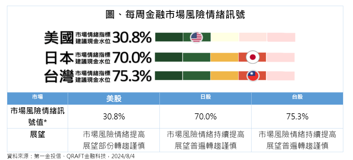 第一金投信與韓國QRAFT金融科技公司(QRAFT Technologies)每周發布金融風險情緒訊號(即市場情緒指標),最新訊號值顯示,美日台展望續趨謹慎,且全面提高現金水位降低曝險比重,美國投資情訊明顯趨謹慎保守,風險情緒值躍升至30.8%,日、台風險訊號全面亮紅燈,風險情緒值躍升至70.0%、75.3%。
