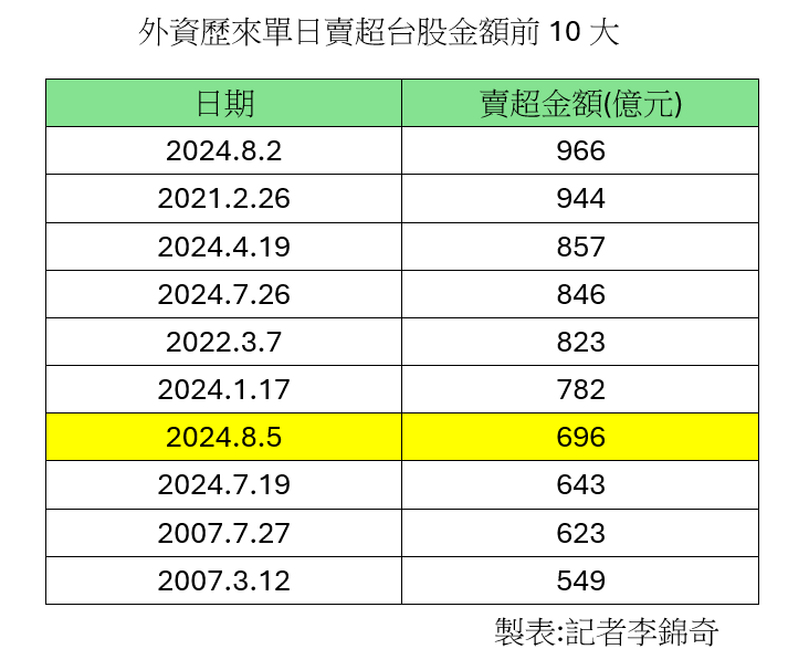 證交所盤後也公布三大法人進出統計,其中,外資賣超696億元,名列歷來單日第7大賣超,並未再創單日新高。