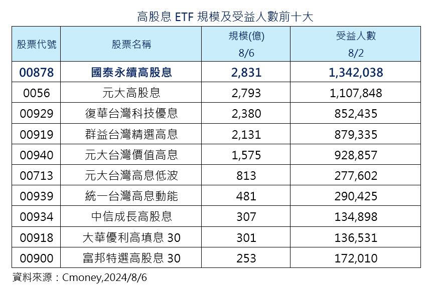 排名居次的0056,基金規模也高達2793億元,受益人超過110萬;復華台灣科技優息(00929)基金規模2380億元,群益00919基金規模2131億元,以上四檔都是規模超過2千億元的重量級ETF。