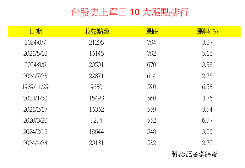 台股原本的收盤漲點記錄,是在2021年5月18日的792點,今天一舉突破改寫。不過,台股盤中最高漲點,仍是昨(8月6日)的920點,今天並未突破。