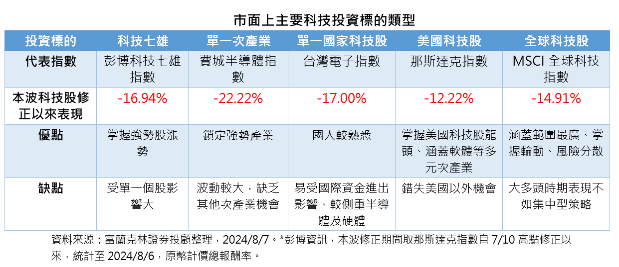 富蘭克林證券投顧表示,科技投資標的種類眾多,按照投資範圍由小至大大致可區分成五種類型,分別是科技七雄、單一次產業、單一國家科技股、美國科技股及全球科技股。