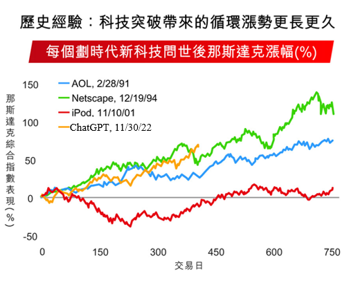 滙豐超核心優化多重資產基金預定基金經理人楊博翔進一步說明,回顧自1991年至今,歷史上一共有4次劃時代的新科技問世,數據顯示,在新科技問世後3年內,那斯達克綜合指數皆受惠科技技術革新而有正向表現。更關鍵的是,AI自2022年底新一代Chat GPT橫空出世至今僅1年多,顯示AI對股市產生的正面影響仍有機會延續。