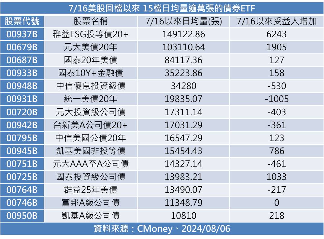 美股S&P500指數7/16創歷史新高並自高點回落以來,檢視投信發行的債券ETF成交狀況與受益人變化,有15檔產品期間之日均量突破萬張,以投資級公司債ETF和長天期美債ETF上榜為多,當中又以00937B群益ESG投等債20+交易最熱絡,是唯一日均量突破10萬張的債券ETF,近14.9萬張,且同期間其受益人數更大增近6243人,同樣為債券ETF之冠。
