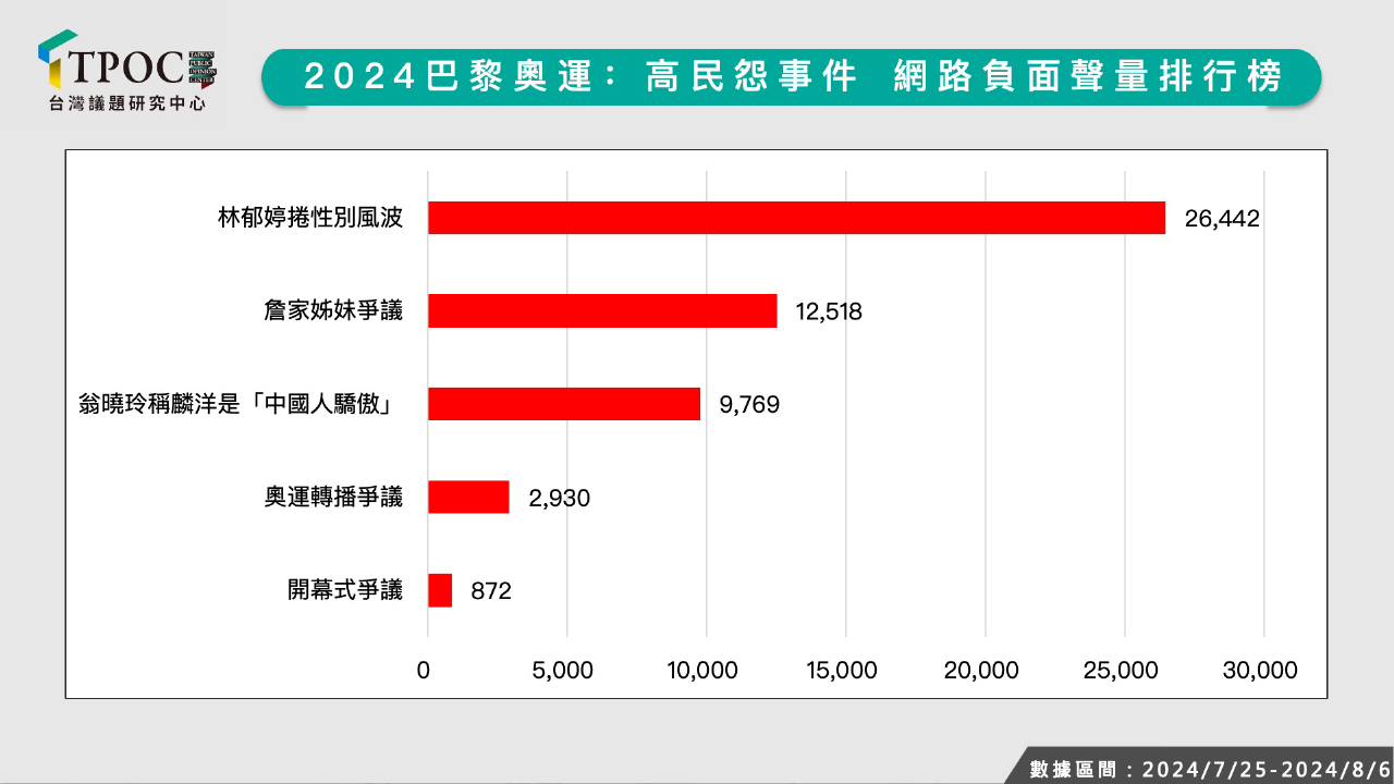 TPOC台灣議題研究中心藉由QuickseeK快析輿情資料庫蒐集巴黎奧運期間的網路聲量,並彙整其中吸引負面聲量砲火的「高民怨事件」,其中,台灣女拳王林郁婷遭國際拳擊總會(IBA)指稱不符合女子拳擊參賽資格,引發台灣民眾憤怒,相關負面聲量超過2.3萬則,居負面聲量之冠,事發後體育署提出嚴正抗議,中華奧會也由律師發警告信函給國際拳總,宣稱必要時將提告;另外代表中華隊出戰網球女雙的「詹家姊妹」詹詠然與詹皓晴首戰直落二落敗,被大批網友酸爆,負面聲量超過1.2萬則排名第二。