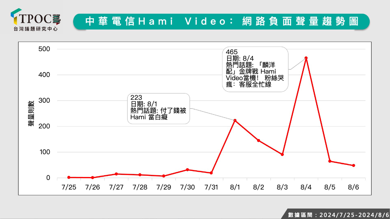 中華電信 Hami Video 以「懂你想看的 OTT 線上影視平台」作為宣傳口號,但在4年一度的奧運轉播期間,卻屢次發生當機和付費無法正常觀看的「落漆」情況,讓許多觀眾失望不已。綜觀本屆奧運「犯眾怒」的事件,撇除選手本身的風波外,引發民怨的主要原因,無非是當台灣人正舉國同慶、凝聚團結意志,並期望世界看到台灣時,卻遭遇少部份人「扯後腿」。例如翁曉玲與對岸同調,稱麟洋配為「中國人」,無疑打擊了國人的士氣。再者如中華電信 Hami Video 平台當機,讓無數民眾無法觀看奧運比賽,打亂了大家為台灣選手加油的熱情。這些在台灣人民最需要團結、選手最需要支持的時刻爆發的扯後腿行為,讓人們感到的失望和憤怒,無怪乎相關負面聲量飆高,成為本屆奧運期間「高民怨事件」。