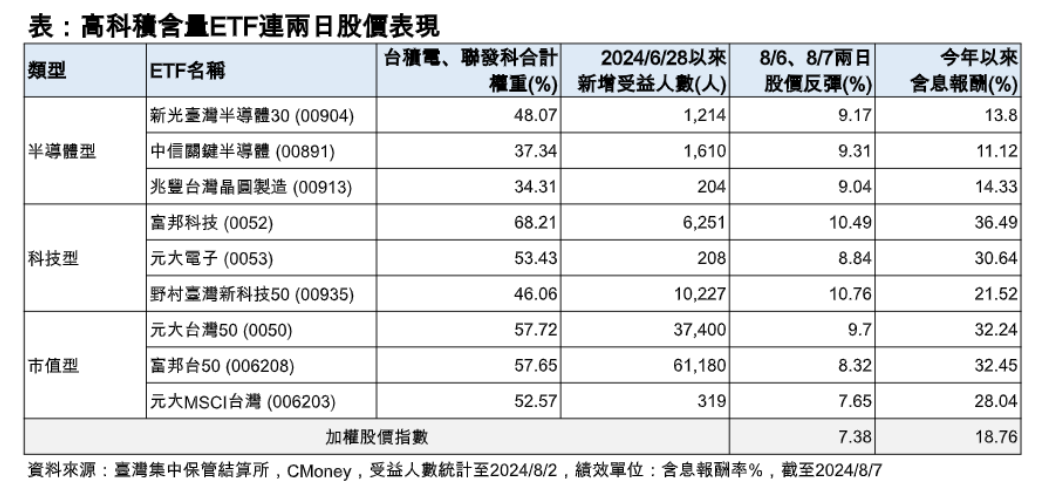 根據CMoney統計,半導體權值股這兩天反彈強勁,包括聯發科、信驊、台積電等,漲幅分別達16.04%、15.36%、12.88%,明顯優於台股的7.3%,若鎖定成分股涵蓋台積電、聯發科的台股ETF,漲勢也打敗大盤。