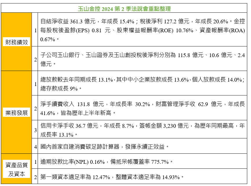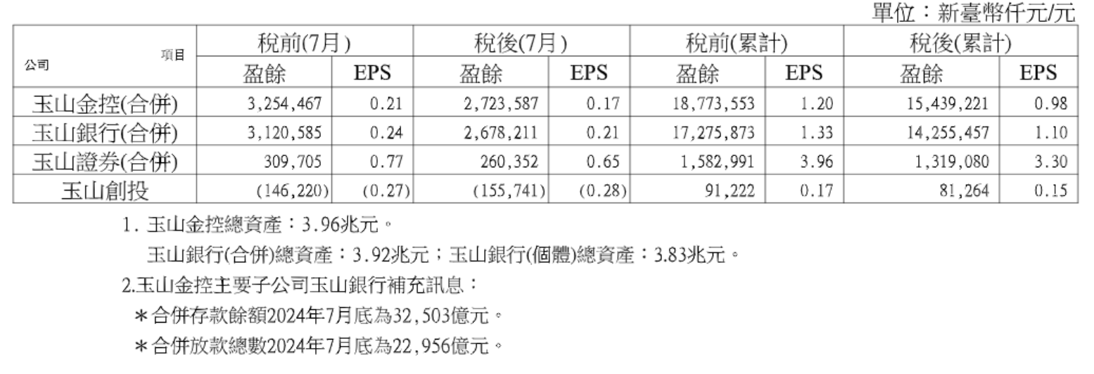 玉山金控昨天最新公佈7月獲利,交出漂亮成績單,單月稅後盈餘27.2億元,累計前7月稅後盈餘154.4億元,年增25.82%,創歷年同期最高, EPS為0.98元。子公司部分,玉山銀行累計前7月稅後盈餘142.6億元,年增30.29%,玉山證13.2億元,年增71.71%;玉山創投0.8億元。
