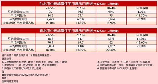 其中,北市中高總價住宅的平均單價在3年間上漲4.7%、新北更上漲11.3%;對比平均坪數卻明顯減少,北市的平均坪數在3年間減少11.3%、新北則減少12.6%,顯示這類住宅市場出現「以空間換總價」現象。
