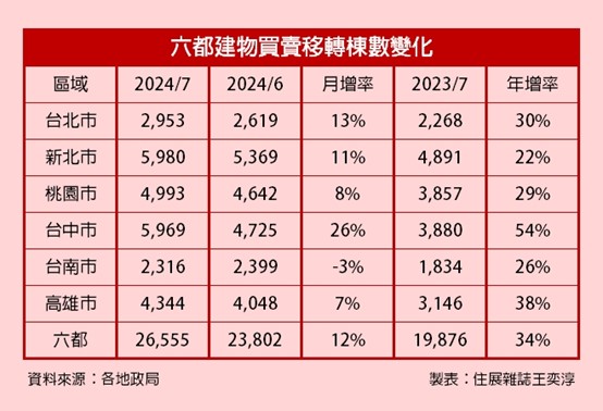 統計顯示,7月六都建物買賣移轉棟數達2.66萬棟,呈現年增34%、月增12%的幅度;其中又以新北、台中的表現特別突出,兩都會區都有高達近6,000棟的水準,台中市5,969棟,月增26%、年增54%;新北市5,980棟,月增11%、年增22%。