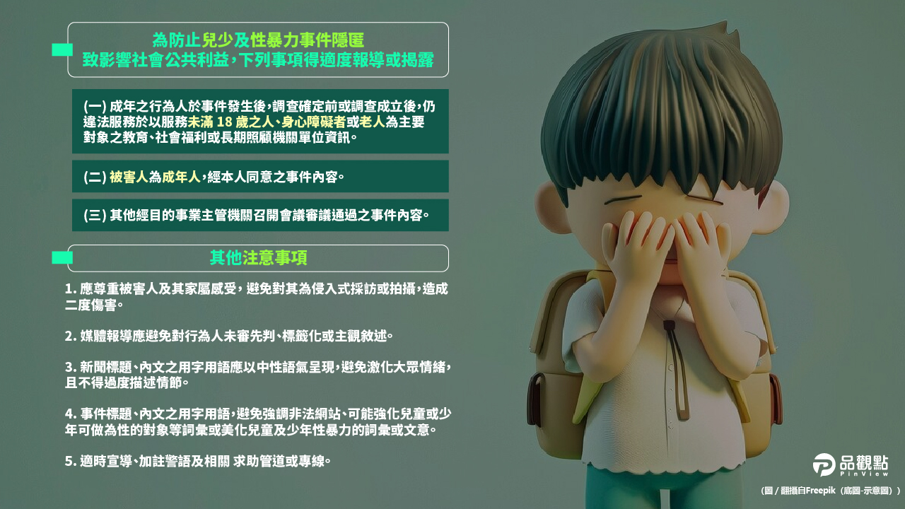 台北市幼兒園狼師案因《兒少法》限制不能報導,導致後續傷害擴大,衛福部12日公布「媒體報導兒少及性暴力事件指引」,新增5大注意事項,明定媒體報導時,避免寫出非法網站,以代號或OOXX代稱;媒體可有條件報導加害者任職機構,但不得揭露被害人身份資訊;「傳播妹」、「公關妹」、「援交妹」等詞彙有「美化性剝削」之意,不准使用。