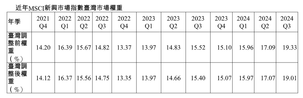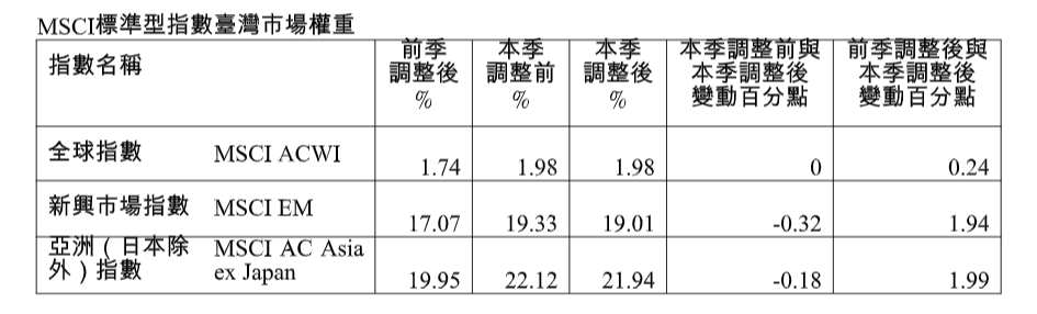 明晟(MSCI)公司今天公布第3季相關指數調整,台股在全球標準型指數(MSCI ACWI)權重維持不變、新興市場指數(MSCI EM)權重下降0.32個百分點、亞洲(日本除外)指數權重下降0.18個百分點,調整後權重分別為1.98%、19.01%及21.94%,呈現2降1平的變化,預計9月2日開盤生效。