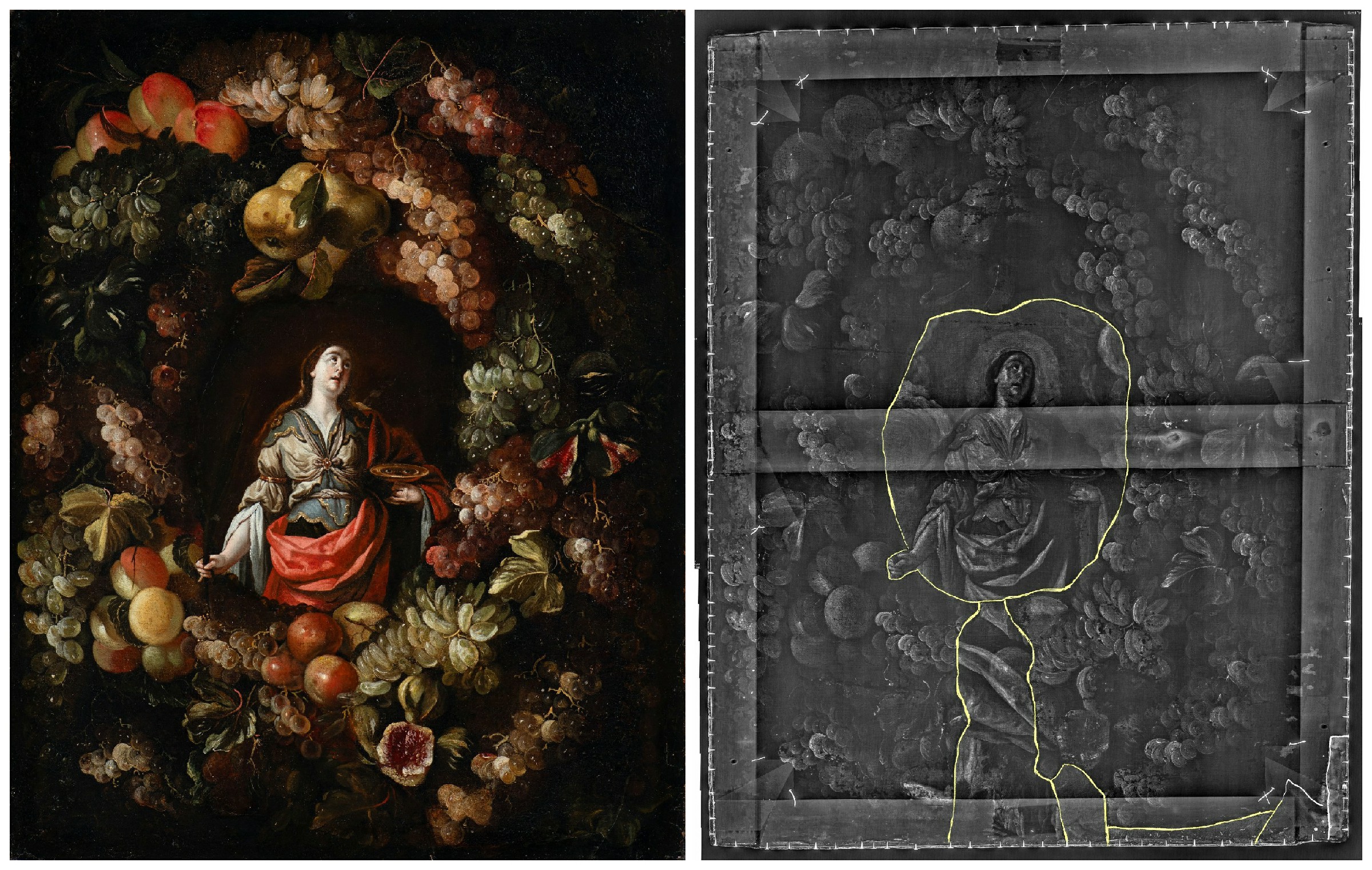 ↑圖說:奇美博物館珍藏展《畫師們》,作品〈果實環串中的聖露西〉透過科學檢測發現,黃色標示出來的區域與環串果實靜物屬於不同畫布。(圖片來源:奇美博物館提供)