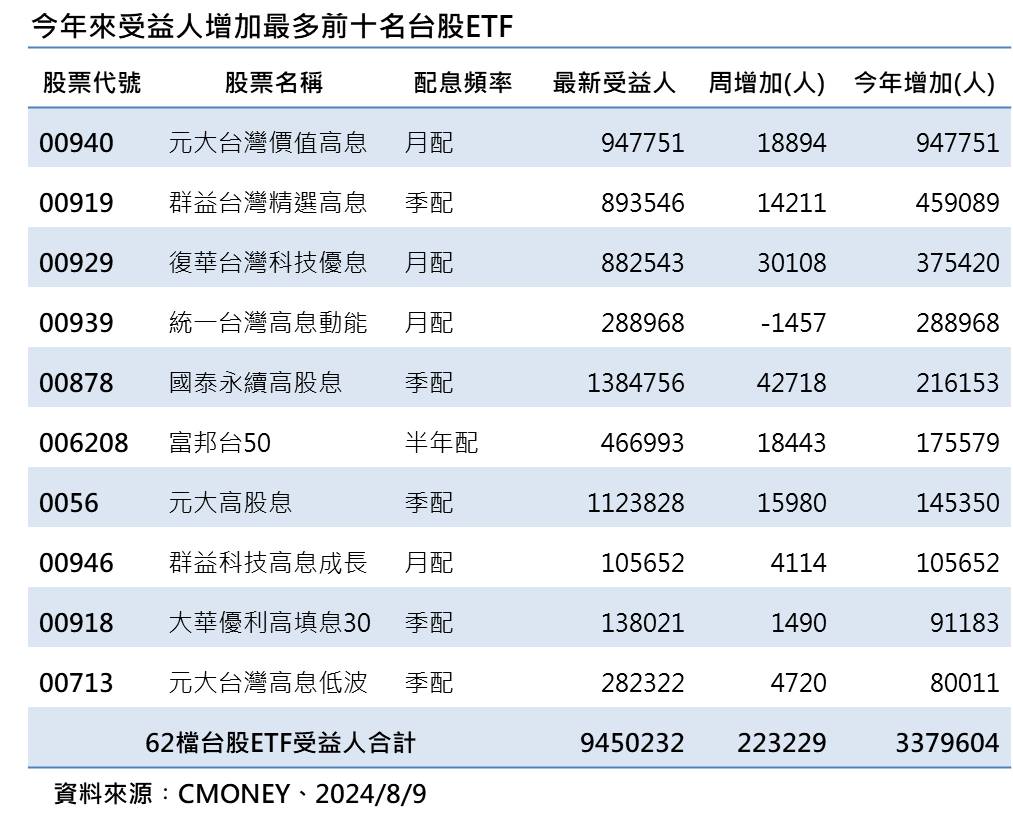 統計今年來,總共增加337萬9604人,以單檔來看,今年增加最多受益人的前五名依序為00940元大台灣價值高息、00919群益台灣精選高息、00929復華台灣科技優息、00939統一台灣高息動能、00878國泰永續高股息,清一色都是高息型ETF,這五檔受益人今年合計增加228萬7381人,占所有增加人數的67.7%。