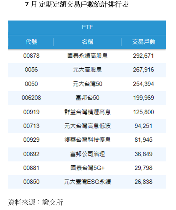 不單受益人增加,定期定額族同樣無懼股市震盪,持續扣款,證交所最新公布7月ETF定期定額交易戶數月排行,前5大分別是國泰永續高股息(00878)、元大高股息(0056)、元大台灣50(0050)、富邦台50(006208)及群益台灣精選高息(00919),高股息佔3檔。
