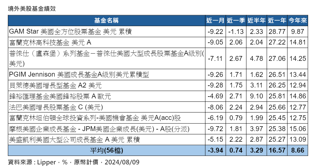 統計目前現有的56檔境外美股基金,近1個月平均下跌3.9%,不過,今年以來,平均報酬率仍有8.6%。
