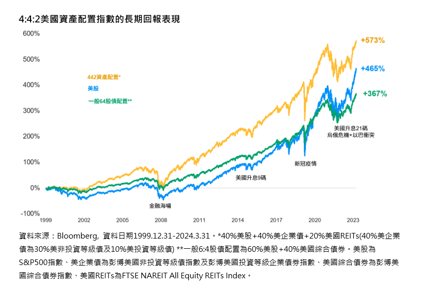楊若萱表示,據統計,在一個投資組合中,若對「美國股票指數」與「美國企業債指數」各配置約4成的比例,然後再搭配約2成的「美國REITs指數」,可發現自2000年以來至今,這種配置策略不只享有比較高的風險調整後報酬,在過去24年內也創下573%的總回報,大幅優於純美股指數的465%累計報酬,或一般股6債4比指數367%累計報酬。