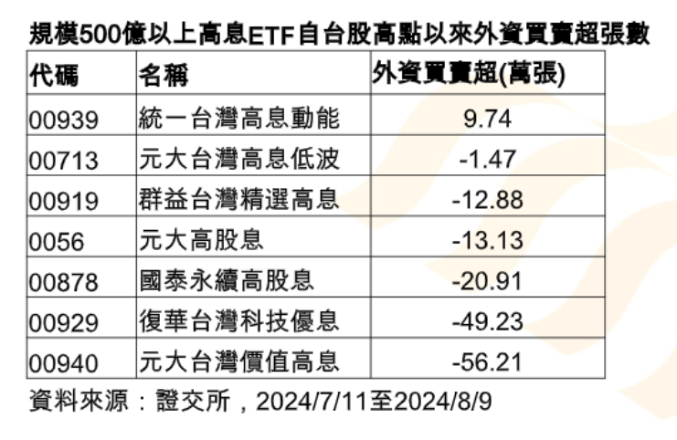 台股今天上漲230點,收在22027點,重返2萬2千點之上,不過,檢視台股在7月11日改寫歷史新高點24416後,開始拉回修正,截至今天為止,這段期間外資累計賣超4209億元,不少高息ETF淪為外資提款機,統計7/11至8/9期間,規模500億元以上的7檔高息ETF中,只有統一台灣高息動能ETF(00939),獲得外資青睞,累積買超近10萬張。