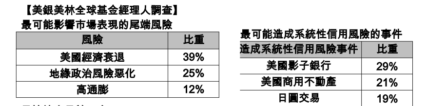 本次調查顯示,美國經濟衰退躍升為市場最擔憂的尾端風險,地緣政治風險居次。