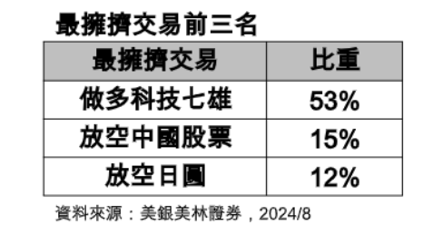 在信用風險方面,美國影子銀行仍為本月最可能的信用風險事件。就交易面而言,做多科技七雄為最擁擠交易,作空中國股票居次。