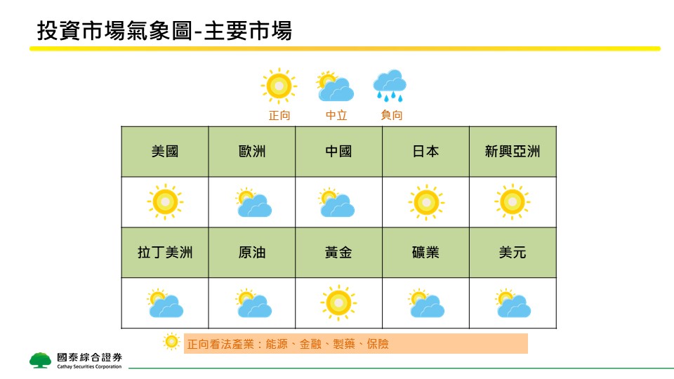 國泰證券針對全球主要股市及商品提出8月投資氣象觀點,對於美國、日本、新興亞洲及黃金抱持「正向」看法,惟仍需多留意美國總統大選所帶來的不確定性風險。