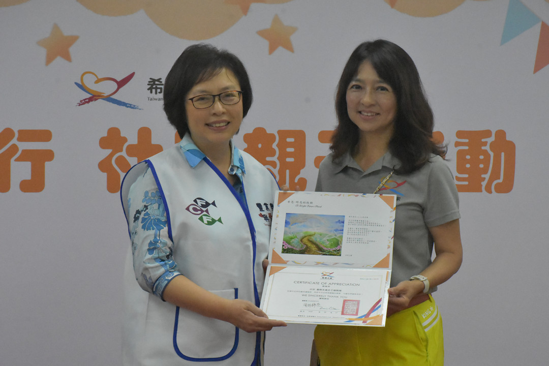 圖說:豐群水產志工服務隊與協理江惠頌(左)參與希恩之家親子活動,希恩之家董事長周林錦燕(右)表達感謝。(圖片來源/豐群水產提供)