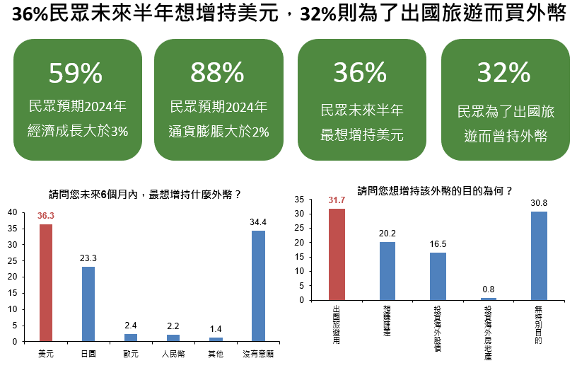 國泰金控今天發布8月國民經濟信心調查結果,受訪民眾對台股的樂觀指數大幅下降至5.3,是去年11月以來新低;未來半年最想增持美元與日圓,最主要目的是出國旅遊用,占比31.7%,但也有20.2%民眾是想賺價差;為了投資海外股債的,只有16.5%。