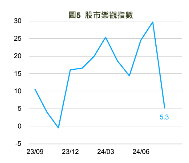 調查結果顯示,民眾對於台股的樂觀指數大幅下降至5.3 (7月:29.7),而風險偏好指數則走低至19.4 (7月:24.9) ,但仍維持在正值的樂觀區間。