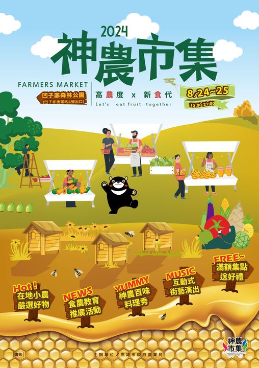暑假已經進入尾聲了,每個月第四個禮拜六、日在凹子底森林公園登場的神農市集,也把握在開學前的周末假日,讓民眾悠閒嚐當季新鮮好滋味!本次以夏季健康飲品-蜂蜜為主題,除邀請到養蜂人家販售國產優質蜂蜜外,還邀請主廚示範以蜂蜜入菜,神農市集匯集百攤的優質農產品攤位,展售當季新鮮的蔬果,推動產銷履歷認證有機農產品、健康永續的飲食文化,每個月都有精彩的演出,可以在欣賞精彩表演的同時,一邊享受多樣的美食,更可以將健康農產帶回家。