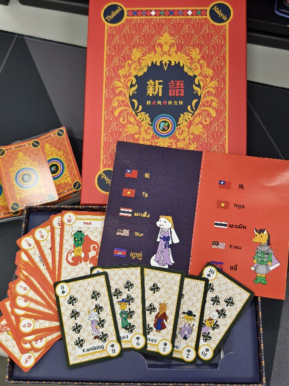 這套新語系列「隨『新』所『遇』撲克牌」,從設計到包裝皆中山工商整體打造,外觀精美,內含撲克牌及說明小冊,撲克牌以傳統12生肖與越南特有的12生肖為靈感,配合撲克牌的1到13的數字,並運用越、泰、馬來與柬埔寨四種文字代表四種花色,設計出獨具新住民風格的圖案。每一張撲克牌上的生肖動物圖案,都是由高雄市新住民老師武綺綿與孩子共同親子創作,再由中山工商專業設計團隊精心打造,運用四國共通的紋飾與紅色系,讓每張牌面呈現鮮明的新住民意象,是高雄市的獨特的文化創作教具,這份教具禮盒將代表高雄市送給新住民教師,豐富他們的教學資源,更是一份真摯的感謝。