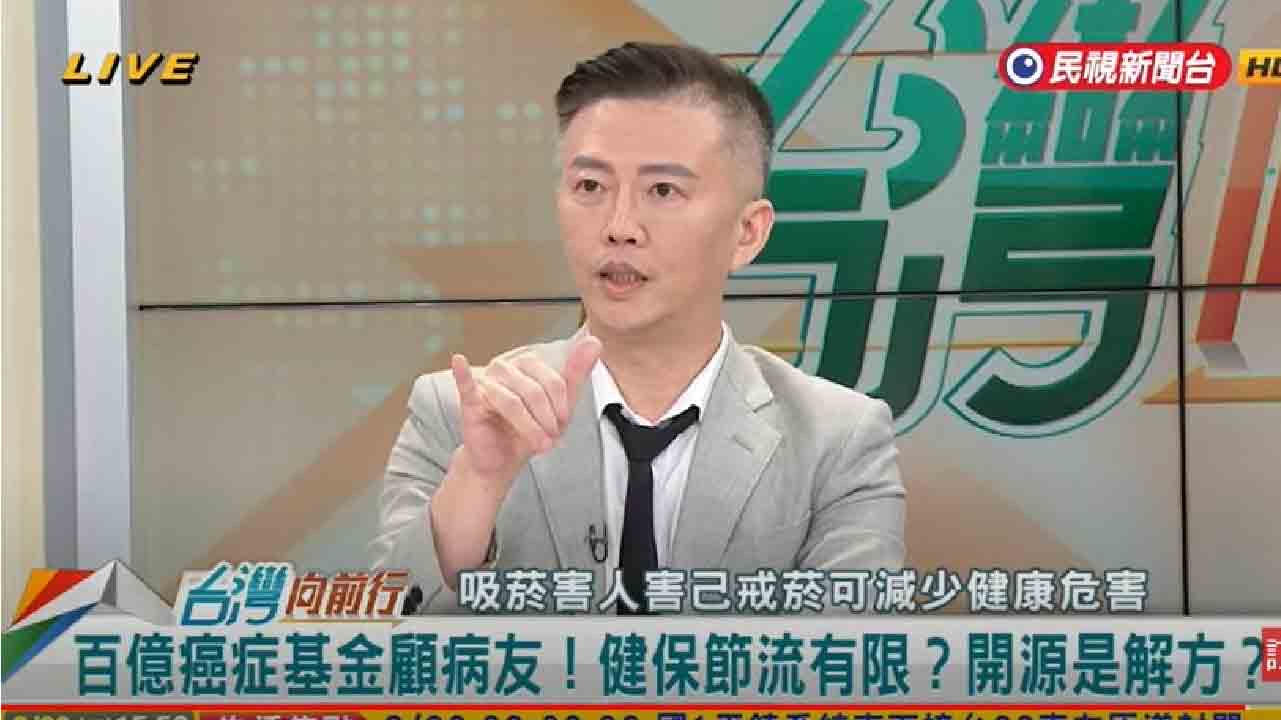 ↑圖說:籌措百億癌症新藥基金財源,立委黃建賓強調重視財源穩定性及時效性,應讓加熱菸菸捐稅成癌症基金穩定財源收入管道。(圖片來源:民視《台灣向前行》)
