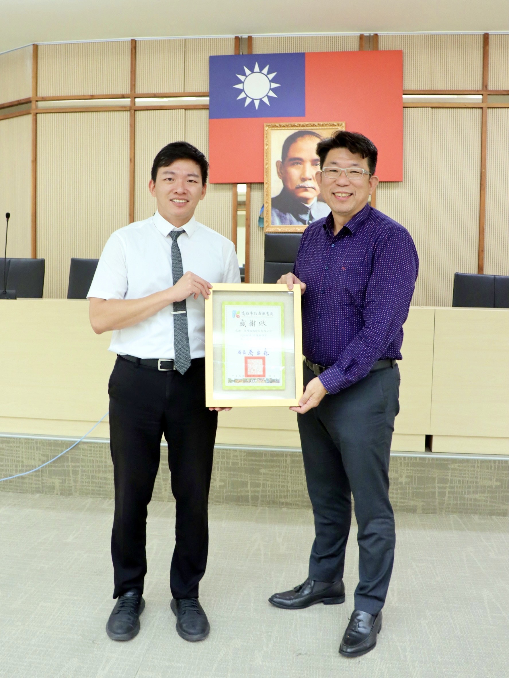 ↑圖說:教育局長吳立森(左)頒發感謝狀予台灣微軟公共業務事業群資深業務協理楊毓峰(右)(圖片來源:高雄市教育局提供)