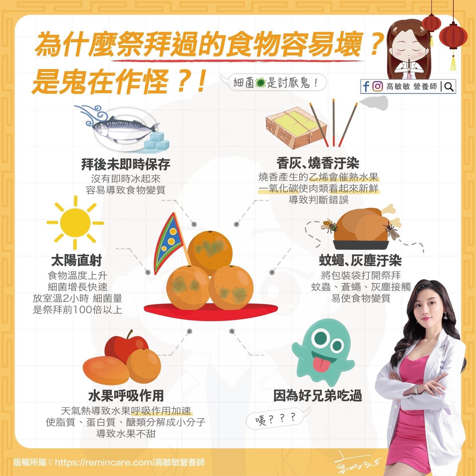 食物在室外祭拜已經大量孳生細菌了,拜完沒有趕快冰起來,會使食物變質的機率更高,如果食物有變質、臭酸請馬上丟棄請勿再食用