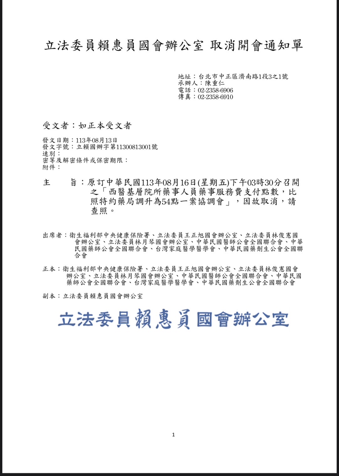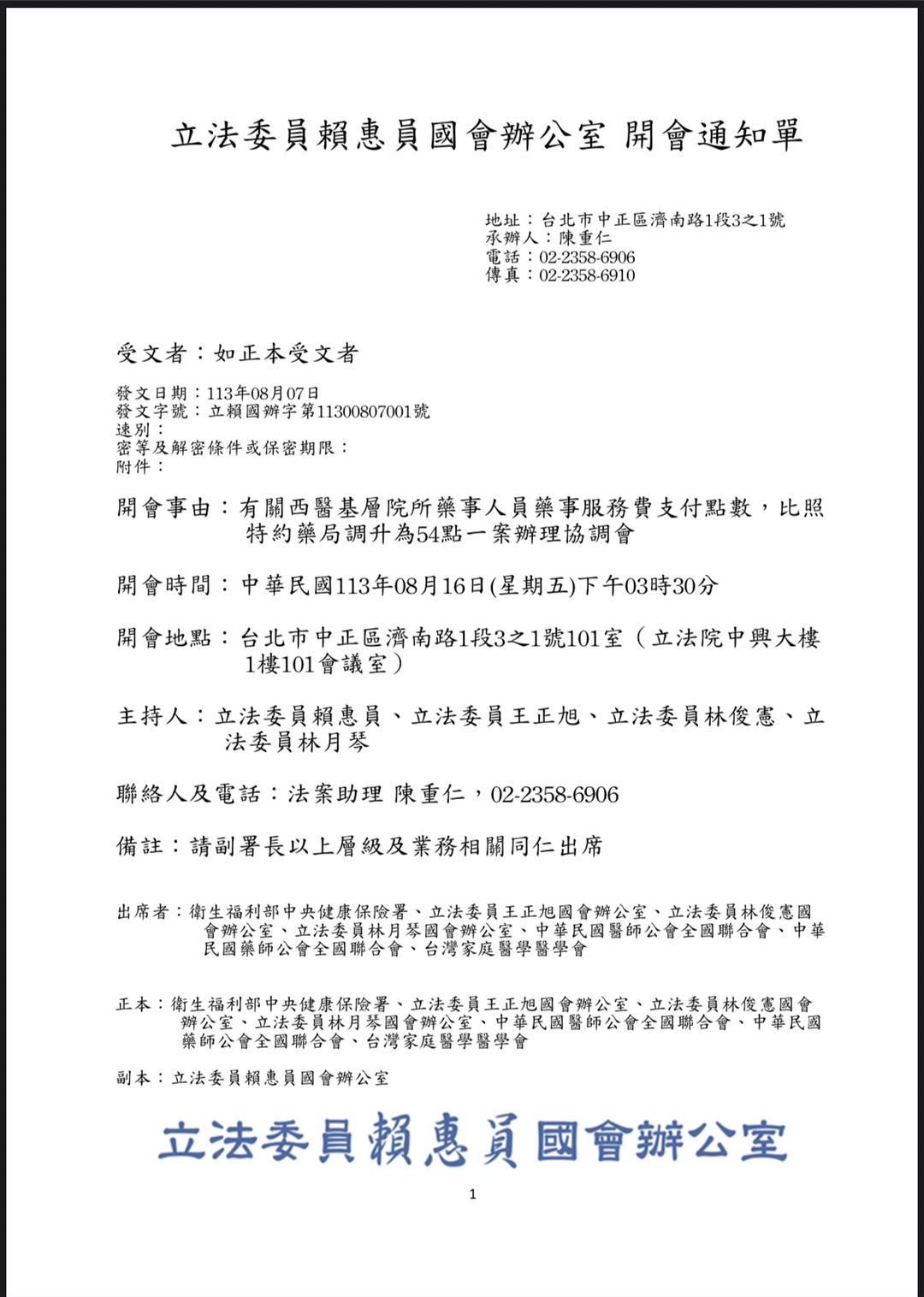圖說:藥師公會收到立法委員賴惠員辦公室的會議通知(藥師公會提供)