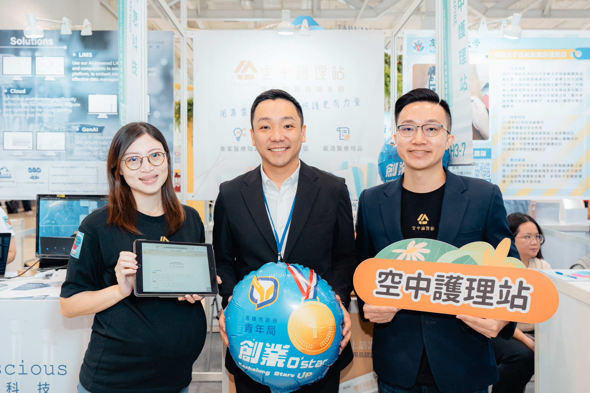 ↑圖說: 「空中護理站」今年以新上線的「空中護理站-居家傷口智慧照護系統」進行參展,創辦人Ethan(右)及Min(左)在會場和青年局長張以理(中)分享公司今年事業展望與創新突破。(圖片來源:高雄市青年局提供)