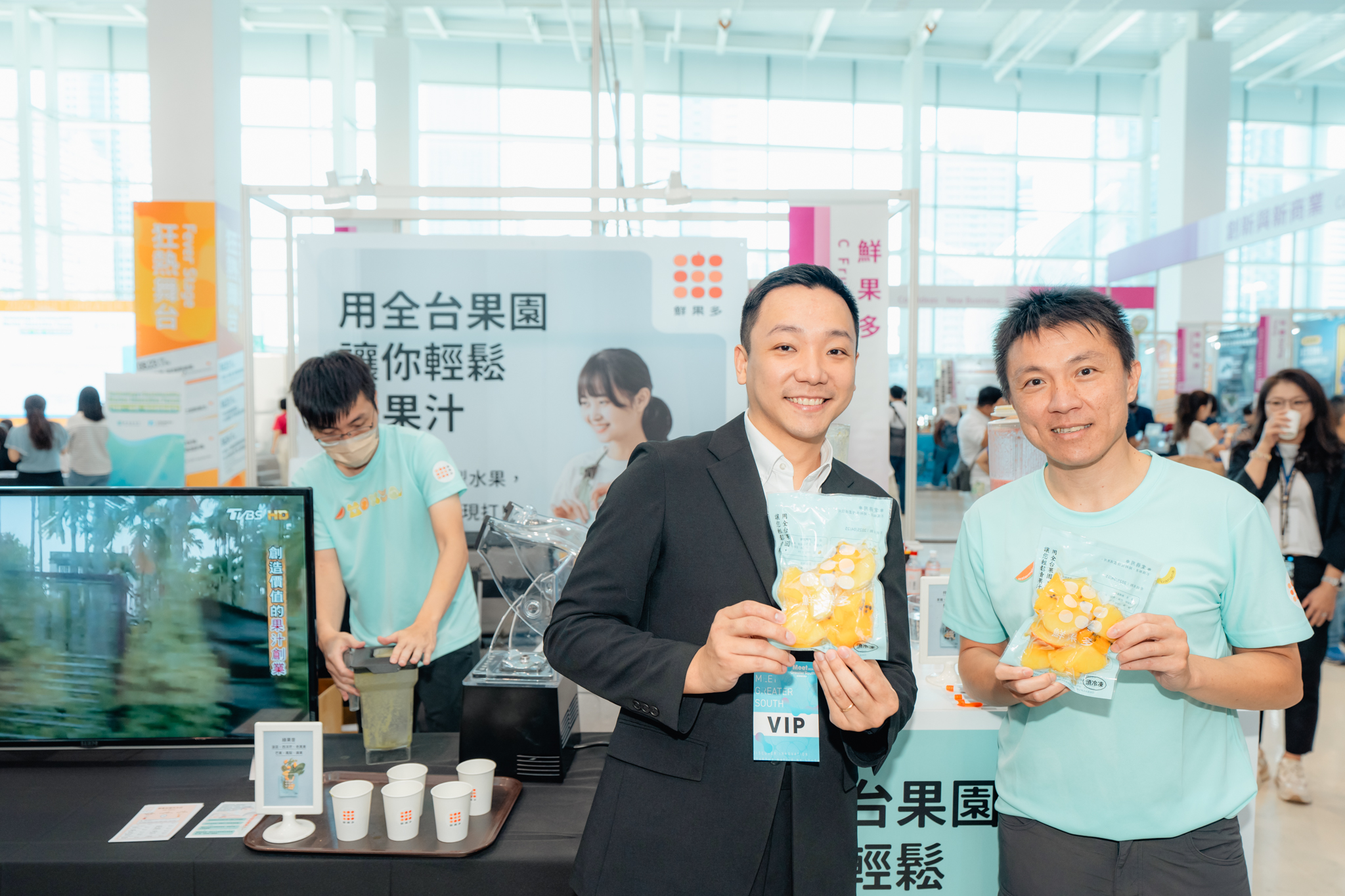 ↑圖說:張以理(中)與鮮果多創辦人Max(右一)合影,創辦人表示創業至今三年,感謝青年局一路支持輔導,讓公司持續成長茁壯。(圖片來源:高雄市青年局提供)