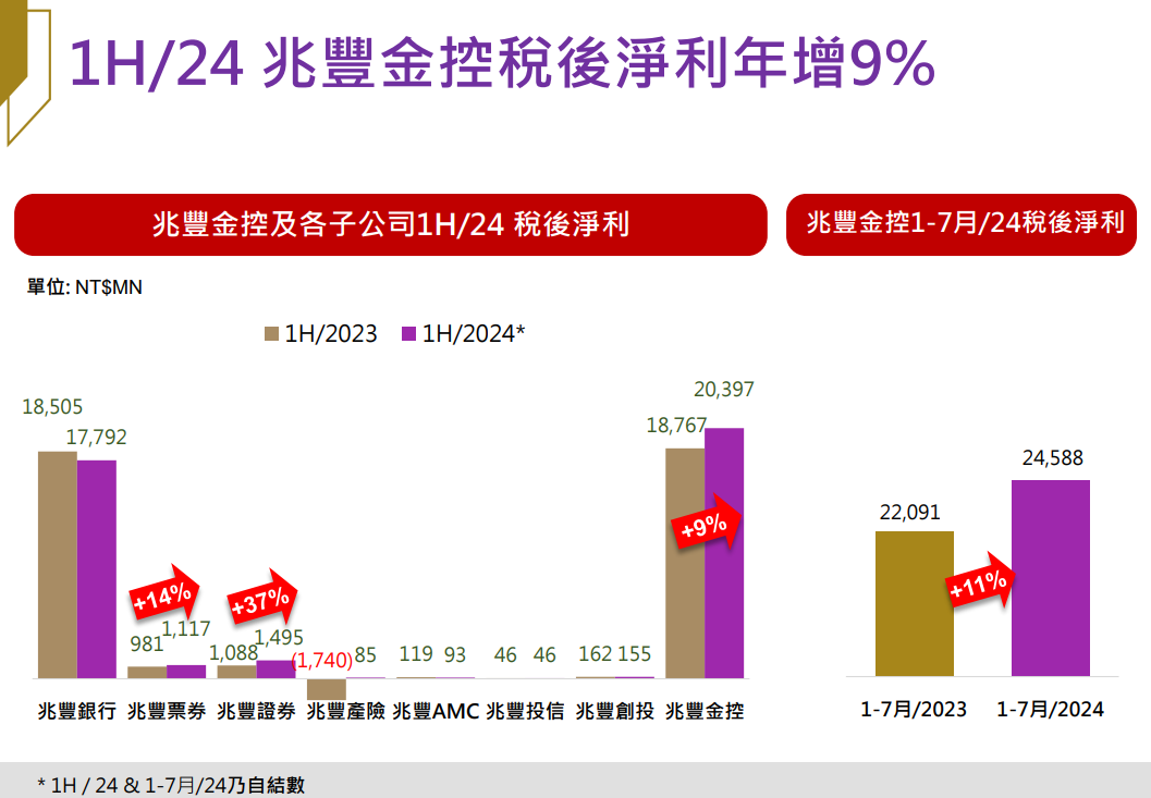 兆豐金表示,上半年稅後淨利創同期史上新高,達203.97億元、EPS 1.42元,年成長8.7%,居公股金控獲利第一,展望下半年,將持續保持高獲利動能;前7月稅後淨利245.88億元、EPS達1.71元,年成長11.3%,稅後淨利穩居公股金融集團的績效冠軍寶座。