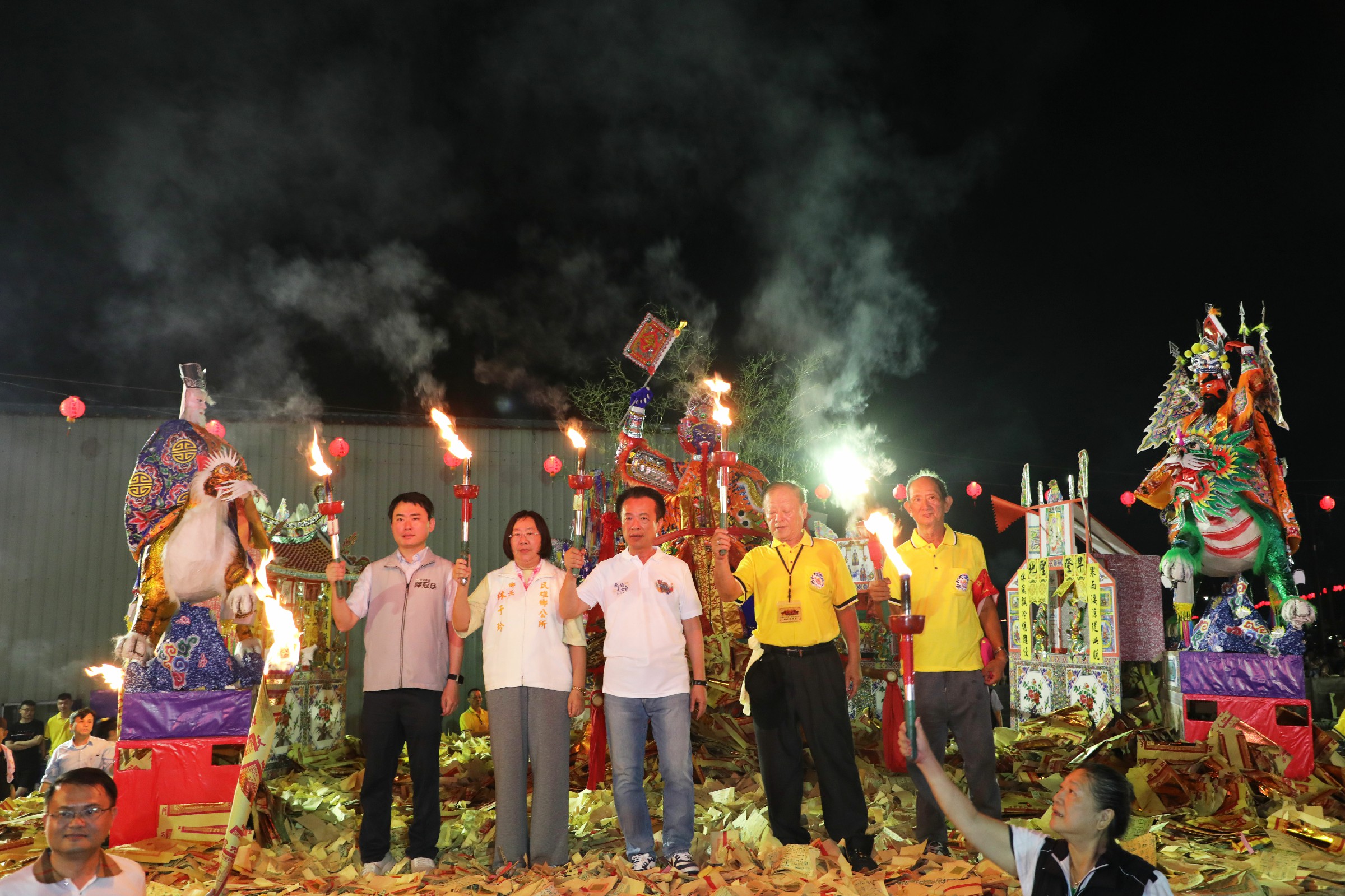 ↑圖說:8月26日(農曆7月23日)深夜由嘉義縣長翁章梁、大士爺廟董事長周漳炎等貴賓一同恭送大士爺「火化升天」,祈禱平安(圖片來源:嘉義縣文觀局提供)