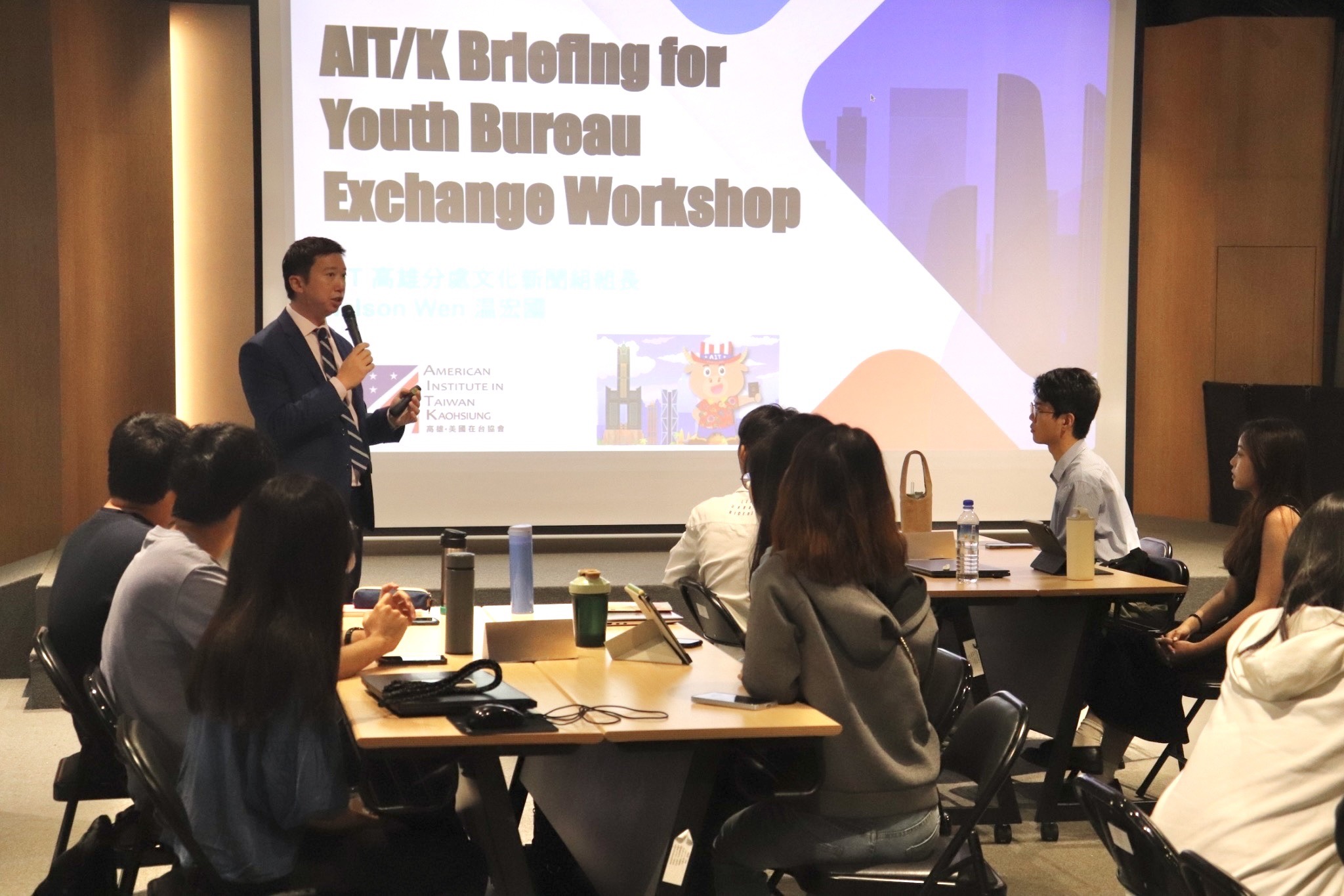 ↑圖說:邀請美國在台協會高雄分處文化新聞組組長温宏國(站立者),以全英文介紹國際外交實務,幫助學員理解外交現況。(圖片來源:高雄市青年局提供)