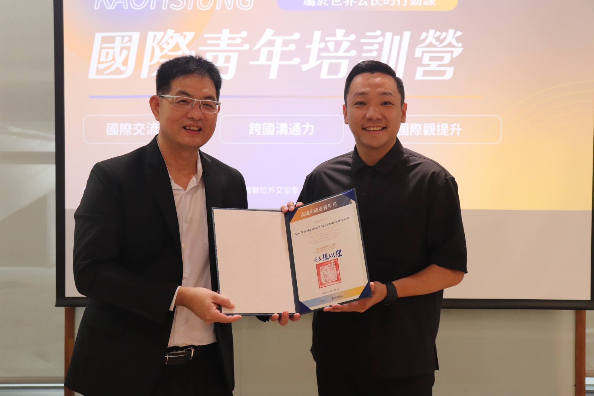↑圖說:青年局張以理局長(右)致贈感謝狀予泰國貿易經濟辦事處勞工處高雄分處。(圖片來源:高雄市青年局提供)