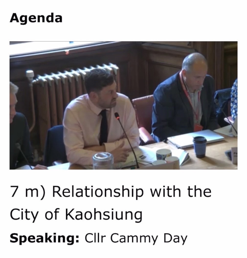 圖說:愛丁堡市議會通過友好高雄決議案,戴伊(左)發言時力挺與高雄交流。