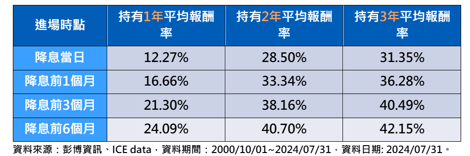 美國聯準會可望在9月啟動降息,市場高度期待,債券以及債券ETF可望迎來利多,大華銀投信指出,根據歷史經驗,在降息啟動前六個月布局長天期投資等級債並持有一年以上,平均報酬率可望超過2成;若在宣告降息當天才布局但仍持有一年以上,平均報酬率也有超過1成。若之前還在觀望的投資人,現在布局長天期投資等級債,仍不算太晚。