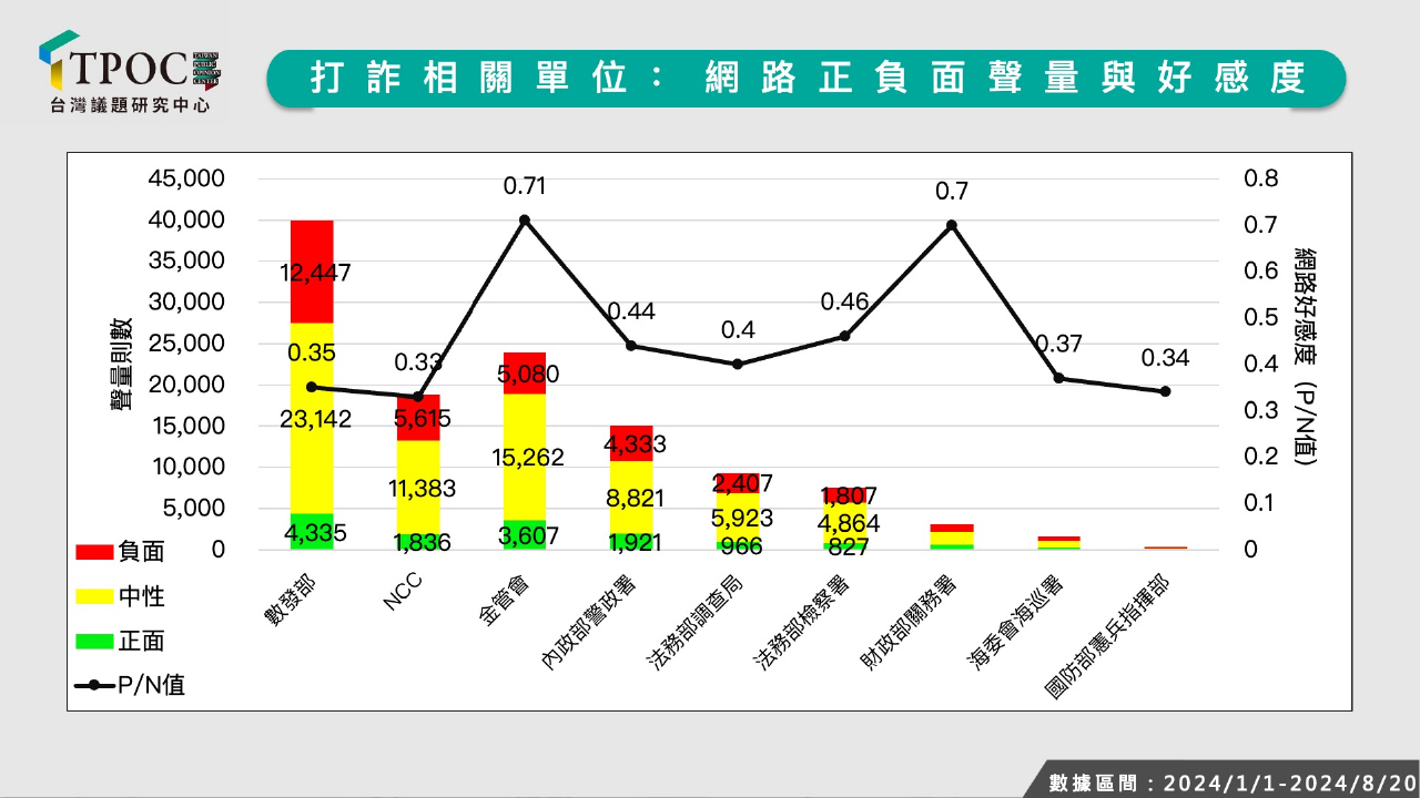 TPOC台灣議題研究中心透過QuickseeK快析輿情資料庫,蒐集被賴清德點名的「檢、警、調、憲、海關、海巡、數位、金融及電信」等單位的網路輿情聲量數據,並分析今年以來相關單位在詐騙、打詐議題方面的網路討論度,結果顯示,數位發展部登上打詐工作最「顧人怨」的部會,負面聲量高達1.2萬則,網路好感度(P/N值)僅0.35;負聲量排名居次的國家通訊傳播委員會(NCC)也不遑多讓,負面聲量有5615則,好感度敬陪末座僅0.33;再來是金融監督管理委員會,負面聲量也有5080則,好感度0.71;而其餘打詐相關單位的負面聲量由高至低為第四名的警政署(4333則)、第五名調查局(2407則)、檢察署(1807則)、關務署(883則)、海巡署(546則)、憲指部(118則),雖然這些單位所累積的負面聲量不及數發部和NCC等機關那麼多,但好感度均不超過1,顯示負面聲量仍大於正面聲量。