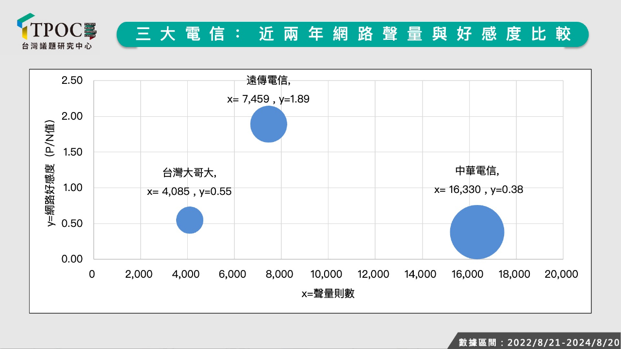 從網路數據可發現,民眾對於一天到晚接到詐騙電話、詐騙簡訊、網路流竄的詐騙訊息深惡痛絕,甚至有人因此影響生活、上當受騙,因此將矛頭指向主責「通訊流」打詐的數發部和NCC。也有不少民眾認為,電信業者本身也應承擔防詐的企業責任,進一步透過網路輿情數據分析觀察,國內三大電信業者近兩年的網路輿情聲量及好感度表現大不同,遠傳電信好感度高達1.89居冠,反觀中華電信總聲量高達1.6萬則,好感度卻只有0.38,遠遠輸給遠傳電信(1.89)和台灣大哥大(0.55),且光是中華電信的負面聲量就有5千多則,佔中華電信總聲量的3成以上。