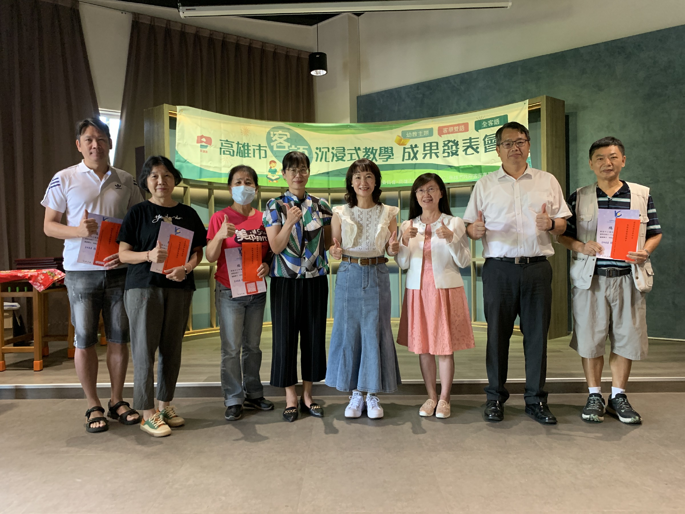 高市客委會27日在美濃國小視聽教室舉辦「112學年度高雄市客語沉浸式教學成果發表會」, 美濃、杉林及六龜地區推動112學年度客語沉浸式教學之學校40餘位校長及教師參加,高市客委會楊瑞霞主委全程與會,並與教育局沈素甜督學共同頒發獎勵及感謝狀,共有美濃、廣興、龍肚、吉東國小附幼等獲得特優園所,並頒發國中小績優教師、全勤獎等。會中針對學年度執行成果及精進輔導等議題進行報告,也邀請高師大鍾鎮城教授及3位執行客語沉浸教學教師分享實際推動學作法。